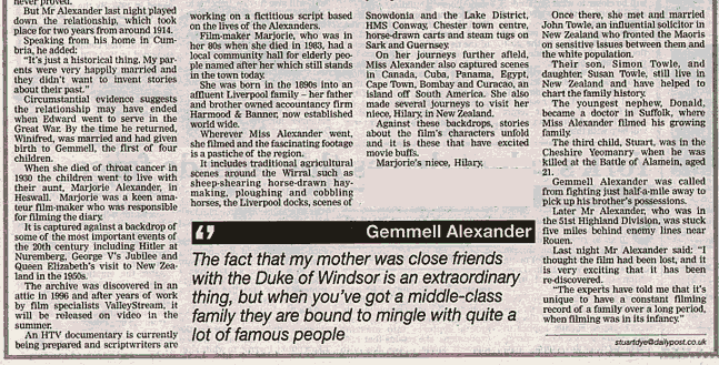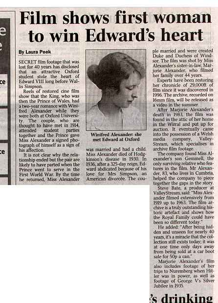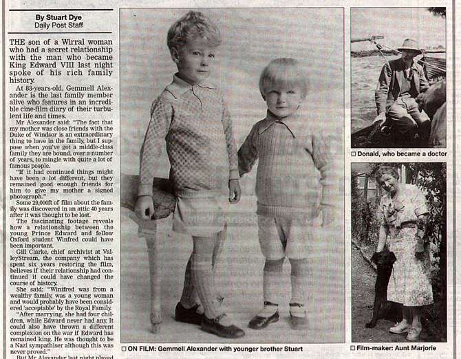 When, in 1996, it was discovered, the reels totalling 29,000ft attracted an array of fascinated film experts and historians. And, after six years of work, the archive, recorded on 16mm film, will be released as a video in the summer. The film diary that has emerged charts the lives of an upper-class family growing up in Wirral and North Wales. It provides one family's personal history against a backdrop of some of the most important events of the 20th century. And it offers a suggestion that the monarchy could have been a very different one today as it reveals the young love between the man who was to become King Edward VIII and a fellow Oxford student.